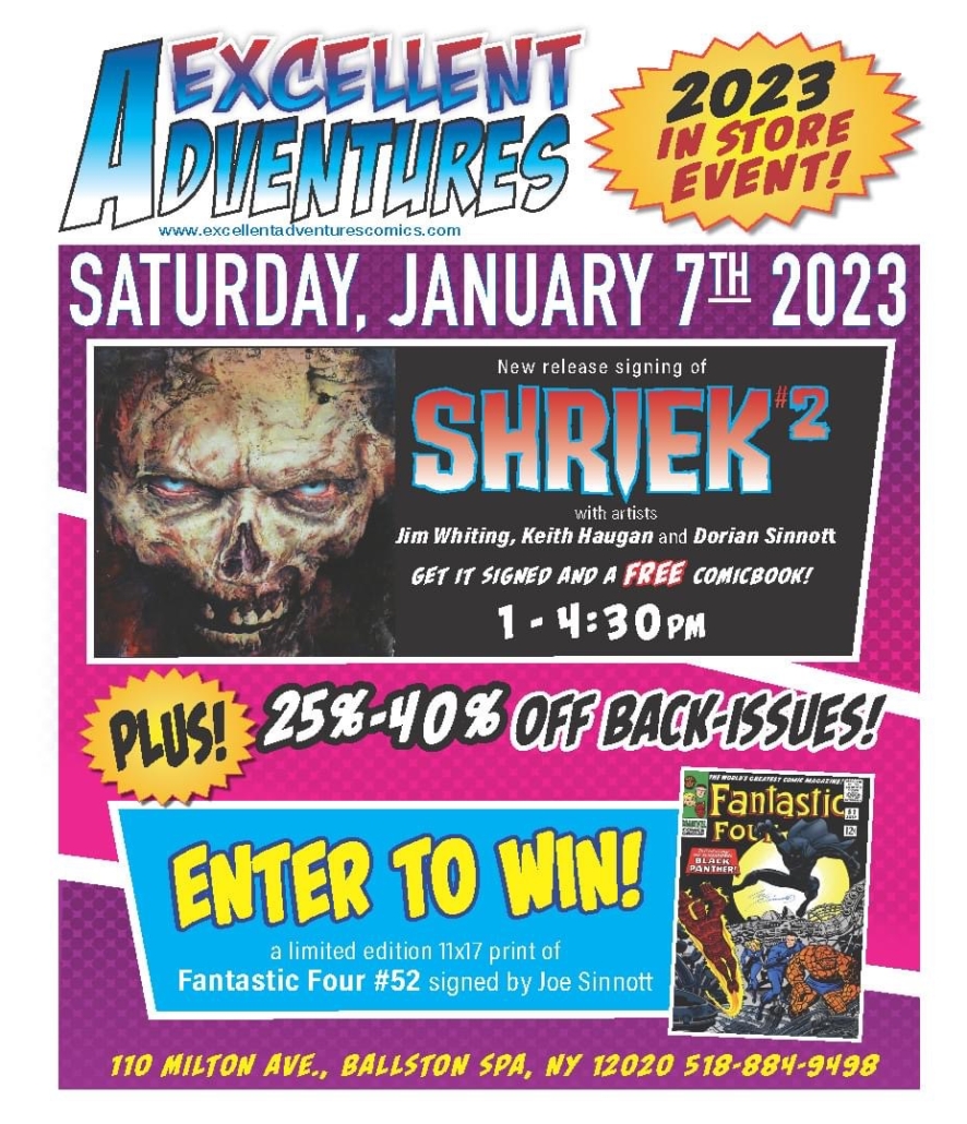 2023 IN STORE EVENT! SATURDAY, JANUARY 7TH 2023 New release signing of SHRIEK 2 with artists Jim Whiting, Keith Haugan and Dorian Sinnott GET IT SIGNED AND A FREE COMICBOOK!